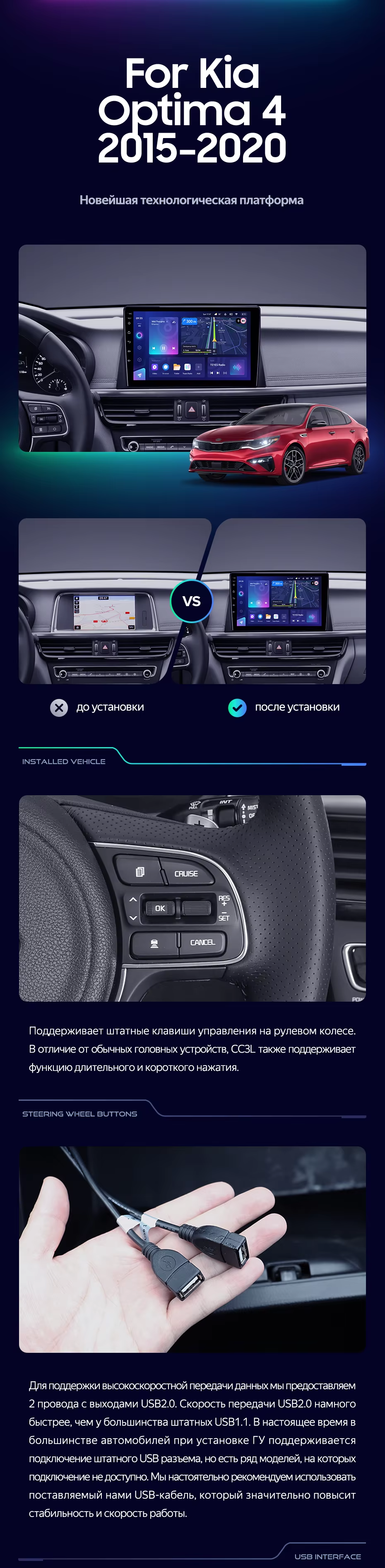Полный комплект установки магнитолы Teyes с рамкой и проводкой можно выбрать в каталоге штатных магнитол Kia Optima 4 JF (2015-2020).