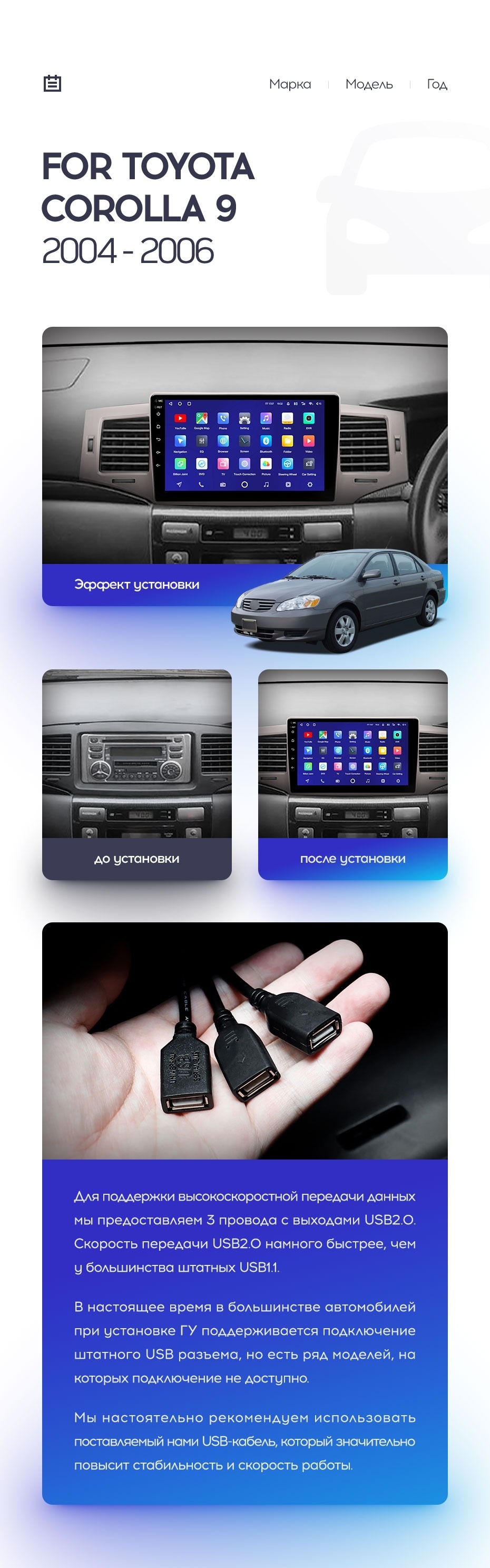 Полный комплект установки магнитолы Teyes с рамкой и проводкой можно выбрать в каталоге штатных магнитол Toyota Corolla 9 E120 (2004-2006).